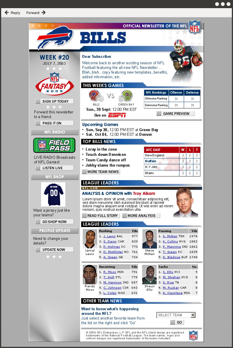 HTML Email design for promoting the NFL.