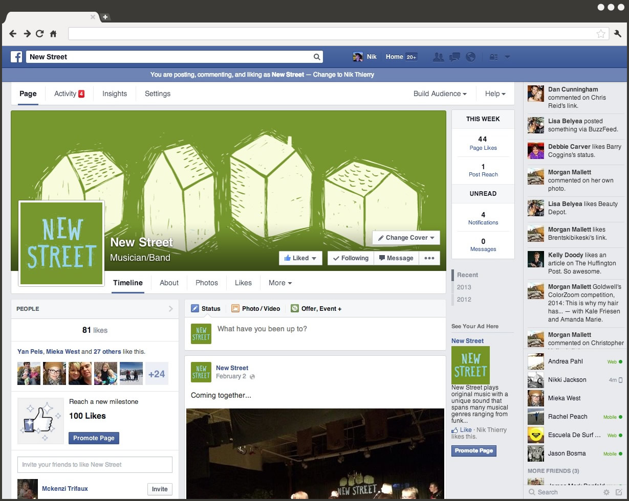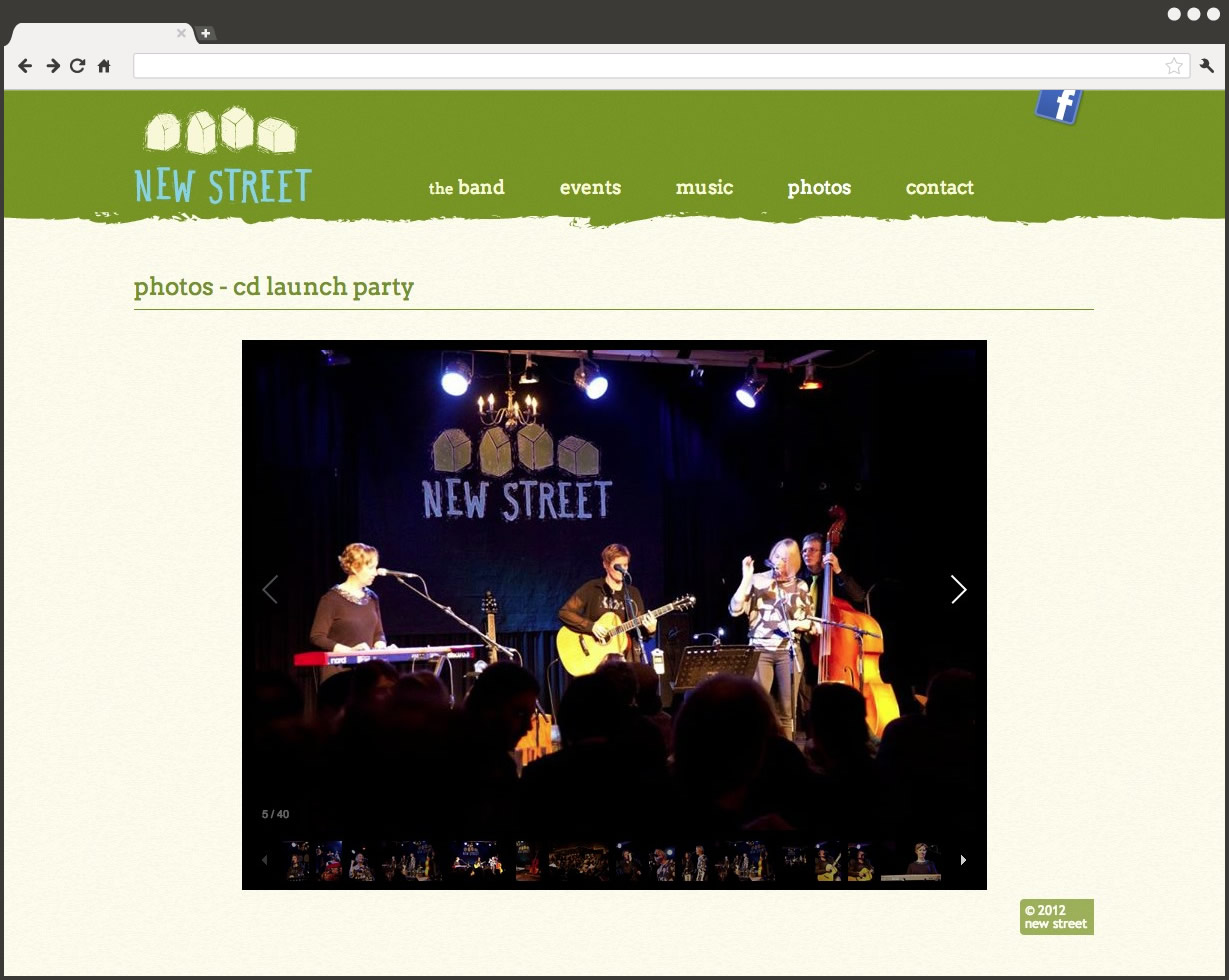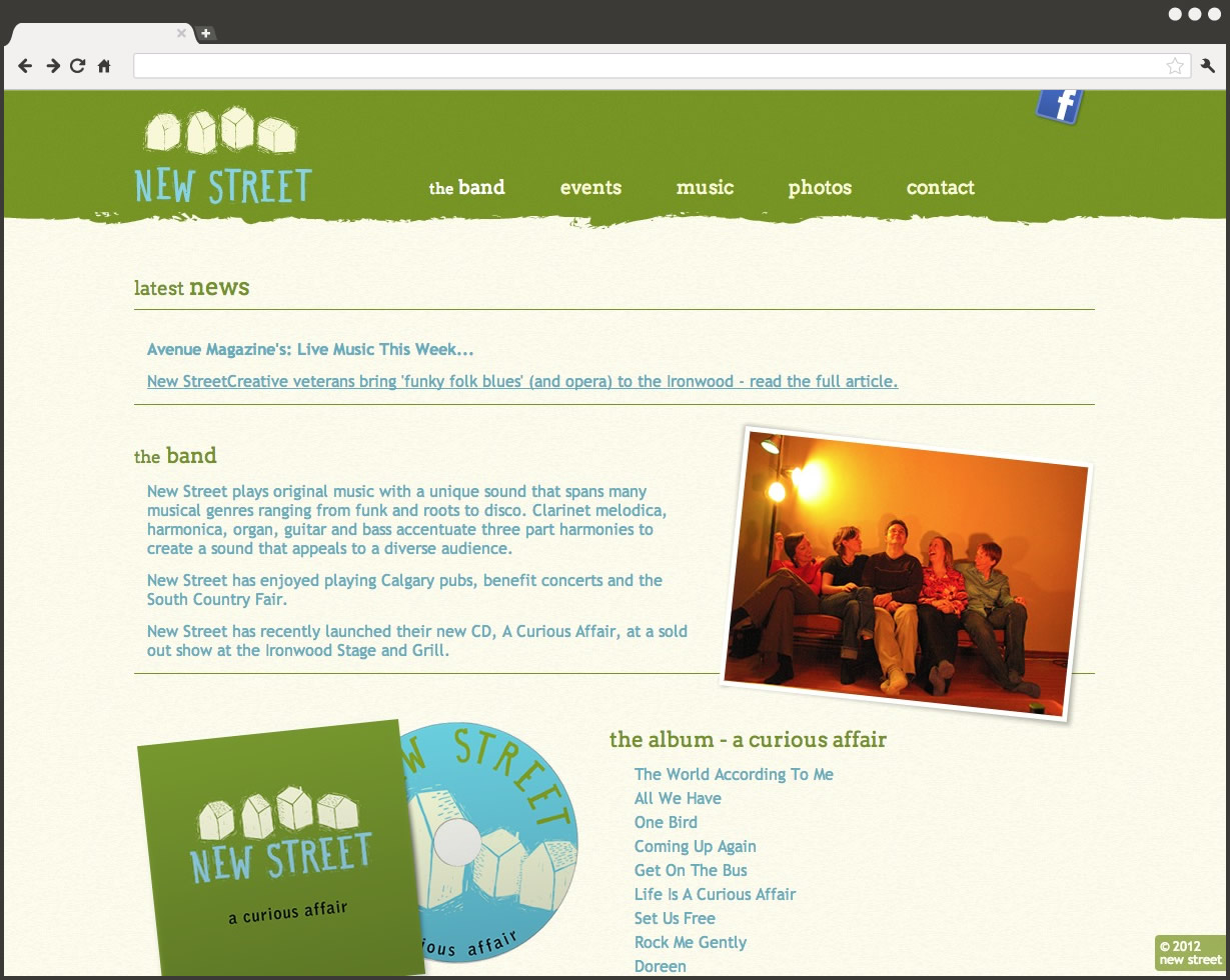 New Street plays original music with a unique sound that spans many musical genres ranging from funk and roots to disco. The group plays Calgary pubs, benefit concerts and the South Country Fair.